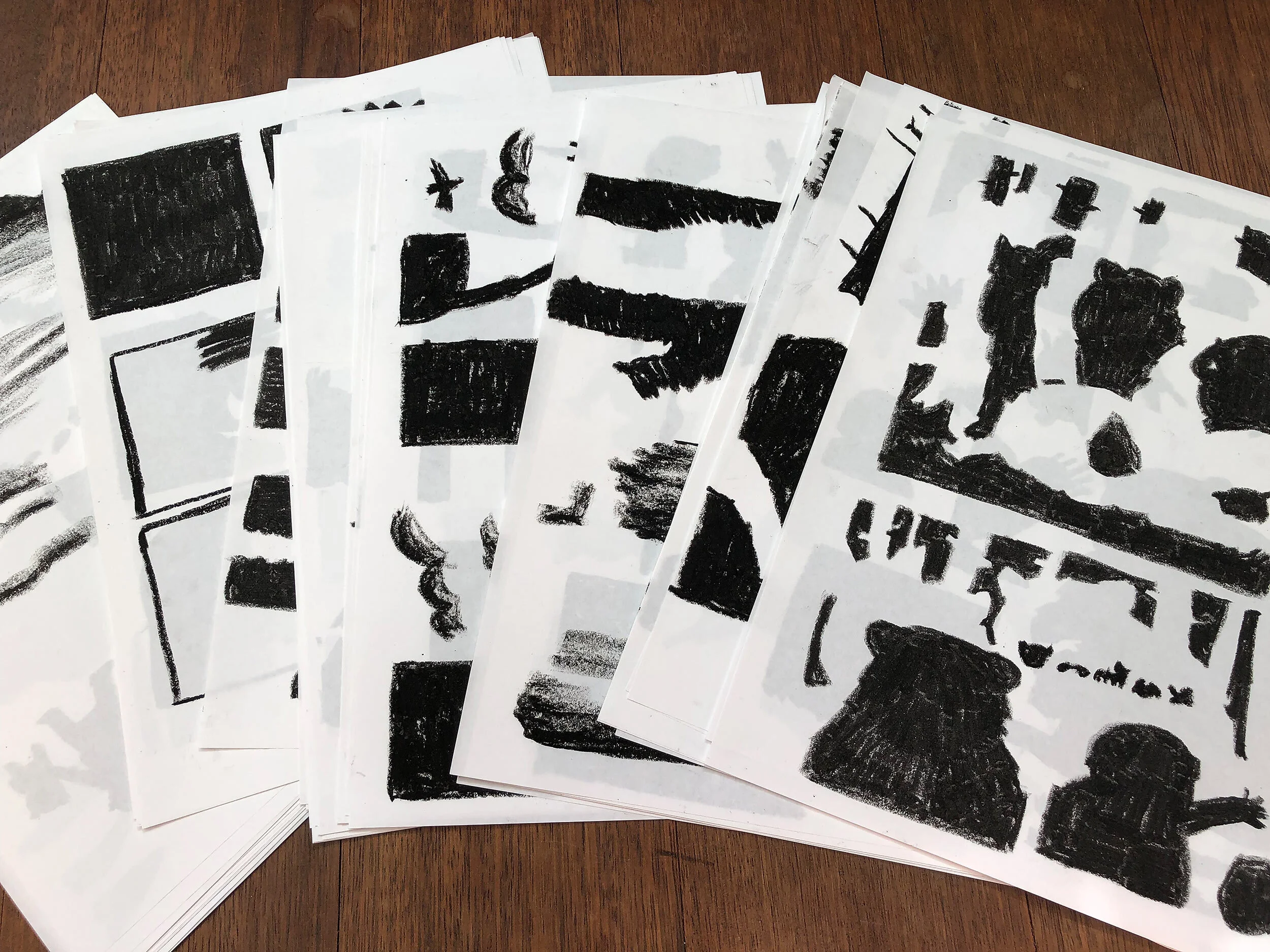 Thats why we used only black pastel. We would put a fresh sheet of layout paper on the top of a finished drawings and just fill all of the areas. The pastel isn’t a precise tool and drawings were small, so the colour bled nicely beyond the contour and panel borders. More detailed separation was made in Photoshop (e.g. main character with a teddybear was usually coloured as one shape that was later divided into areas for face, shirt, backpack, bear, etc.).