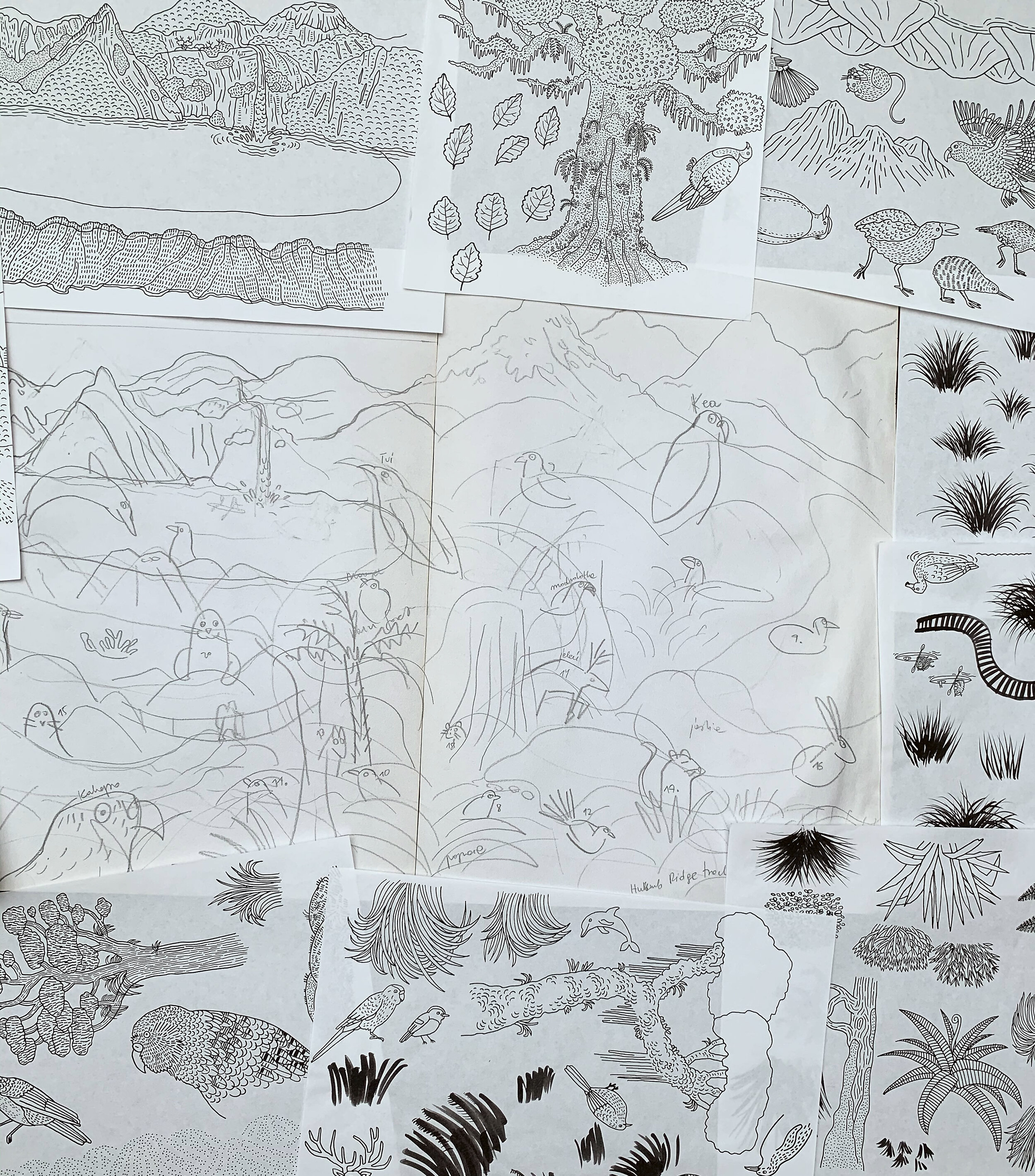 At first we thought that having a notebook with rough layout of panels with marked essential elements on them would be a quickest way to plan every chapter (park) in the book. But with a book this size it’s hard to remember about scale. Then we tried to sketch things on a one-to-one size paper, but it was also counterproductive. Finally, we decided to divide the book into chapters/parks and work on one until it was finished, before moving forward to the next one. Our workflow looked something like that: